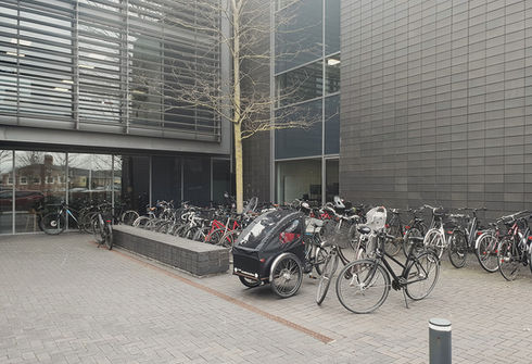 På bookingdagen skal du parkere din cykel I cykelstativerne foran hovedindgangen, se billede.